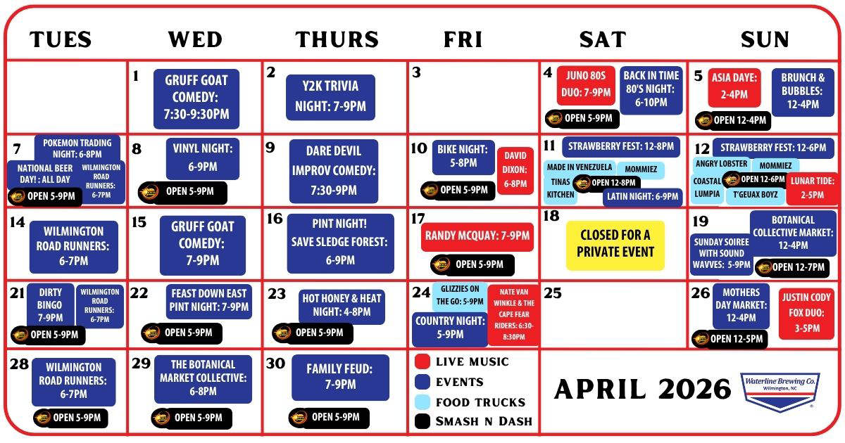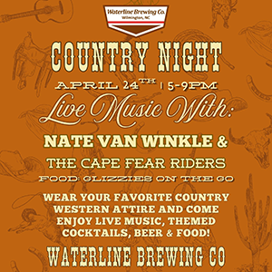 Dust off your boots and round up your crew...it’s time for a honky-tonk good time at Waterline! Live Music with Nate Van Winkle & The Cape Fear Riders will be bringing the country vibes all night long! Glizzies On The Go serving up food, we'll have themed cocktails, and craft beers! Dress Code: Your best country western attire—boots, hats, denim, fringe… go all out.